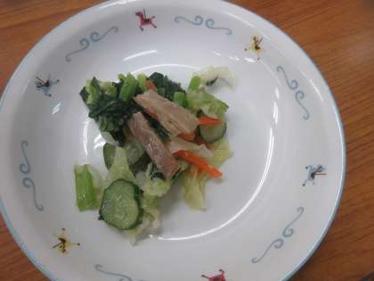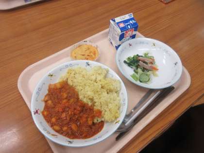 チリビーンズライス、小松菜サラダ、ヨーグルトポムポム、牛乳 チリビーンズライスは、主に豆、肉、トマトにスパイスを加えて煮込んだアメリカ南部発祥の料理です。一般的には、いんげん豆やレッドキドニービーンズを使用し、挽き肉や玉ねぎ、トマトを加えて煮込そうです。給食のチリビーンズは大豆でした。トマトソース、ひき肉、大豆とてもよくあいます。これでチーズが入っていると沖縄のタコライスのようです。小松菜のサラダはあまり食べたことがなかったのですが、さっぱりしていてとてもおいしいです。ドレッシングともよくあい、キュウリやキャベツ、ベーコンともベストマッチです。