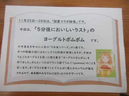今日の図書コラボは“5分後に美味しいラスト”という本に出てくるヨーグルトポムポムです。ヨーグルトの酸味にリンゴの甘酸っぱさがマッチしていて、結構ボリュームもありました。口の中でのヨーグルトとリンゴのコラボは先日ワールドカップスキー混合ジャンプで優勝した日本チームのようで、おいしさが2倍3倍のチカラを出してくれます。ポムポムのポムはフランス語で“リンゴ”のことを呼ぶそうです。