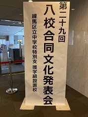 7日(金)練馬文化センターで八校合同文化発表会が実施されました。各学校から多くの生徒、保護者の皆さんが参加され、盛大に発表会を行うことができました。本校はこの発表会ではトップバッターとして出場しました。トップバッターということで、生徒たちはみんなドキドキです。本番のブザーが鳴ると“ヨシ”という気持ちで舞台に立ちました。前日、前々日の校内発表会で演じた『I組の軌跡』を舞台いっぱいに表現しました。演じている時には精一杯で何も感じることができませんでしたが、終わると会場から盛大な拍手が送られて“ヤッター”と言う気持ちがフツフツと湧いてきました。会場で見ていた校長先生もとても感動して目頭が熱くなったとのことでした。本校だけでなく、参加した各学校の発表はとてもすばらしく甲乙つけがたい内容で、会場に来られていた皆さんもとても感動していたとのことでした。今年もすばらしい発表会になりました。毎年陰でこの会を支えてくれている教育委員会の皆さん、各校の先生方、本当にありがとうございました。 11月10日(月) 本日の給食