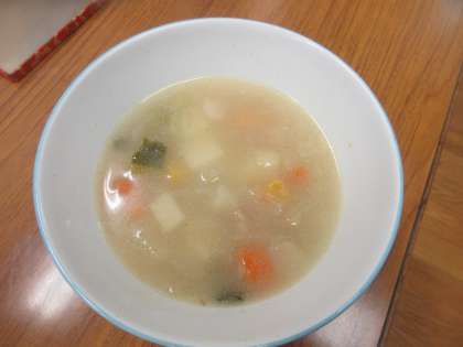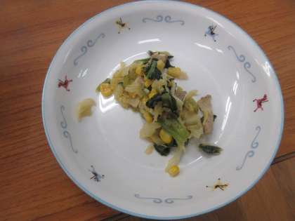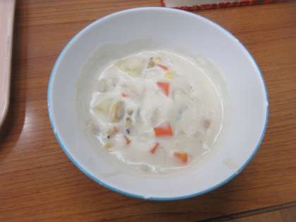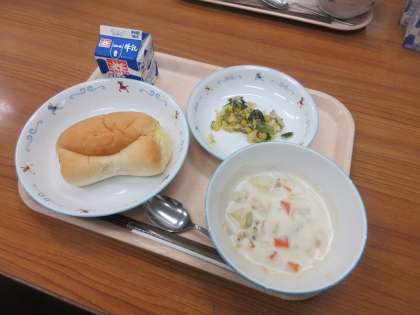 ダイスチーズパン、あさりのチャウダー、野菜のペペロンチーノ、牛乳 チーズパンをちぎって、スープに浸していただきます。パンに汁がしみて、チーズの味と一緒になって美味しいです。今日のスープはあさりのチャウダー、一般的にはアサリをプロセッサーなどで細かく切って入れてありますが、本校のチャウダーはむき身がそのまま入っていて、食感が良く美味しいです。今日も栄養士さんに“なぜそのまま入っているの?”と聞くと左目がキラッと光って“そこが他とはチャウダー”とお返事。思わず“座布団一枚”と言いたくなりました。どちらにしても美味しくて入れ物の中に残っているスープをパンにつけて食べてしまいました。野菜のペペロンチーノは野菜を油でいためて、その時に唐辛子入っているとのこと。こちらもさっぱりして美味しかったです。今日の給食もあっぱれでした。