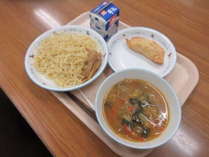 みそラーメン、めんまの炒め煮、さつまいもの包み揚げ、牛乳 テスト最終日、今日から給食が復活です。今日のメニューはラーメン、つけ麺、ぼくみそラーメンということで、寒い日にはピッタリのみそラーメンです。札幌のラーメン横丁を思い出します。アツアツのみそラーメンをフウフウ言いながら食べたのを思い出します。学校なのでそのようなものは出ませんが、いつものつけ麺方式のみそラーメンです。スープには白菜、ニラ、もやし、みそひき肉、コーンなどが入っています。メンマを乗せてヅルヅルといただきます。口いっぱいにスープのコクと麺のモチモチ感が広がります。さらにスープをすすって「ア〜」という声が思わず出てしまいました。包み揚げは大きな餃子、かぶりつくと“ザック〜”中身はスイートポテト、トロッと甘く美味しいデザートでした。寒い日に熱いみそラーメン、最高のごちそうですね。