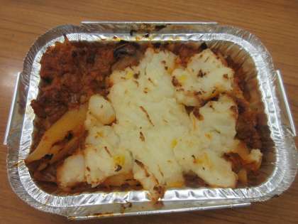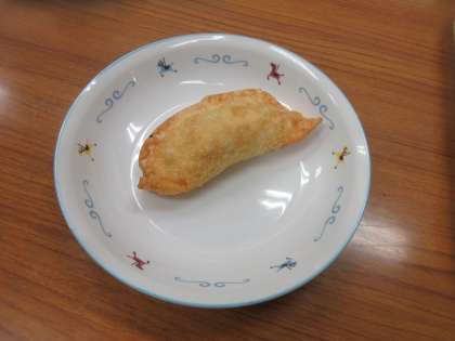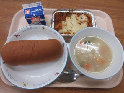 黒砂糖パン、シェパードパイ、ペイザンヌスープ、牛乳 シェパードパイはマッシュポテトでできたパイ皮とひき肉、ジャガイモ、マカロニなどが入ったイギリスのミートパイです。上に乗ったマッシュポテトがトロッとして、ミートソースとマカロニが一緒になっておいしいです。ペイザンヌスープは、フランスの家庭で作られてきた田舎風の野菜スープです。ペイザンヌはフランス語で田舎風との意味があるそうです。野菜を四角に切ったり三角に切ったりしてあり、野菜のうまみがスープにしみ出ています。黒砂糖パンと一緒に食べると美味しさがさらに広がります。最近は給食もオシャレになって先生方の中には料理の名前を聞いただけでは、わからないものも増えて、食べるのが楽しみだという先生も多くいます。今日の料理もイギリスとフランスのものということで私がEUの料理ですねというと社会科の講師の先生が人差し指を横に振ってイギリスはEUから脱退しましたとの専門的なお話。さすが社会科の先生、思わず、納得してしまいました。