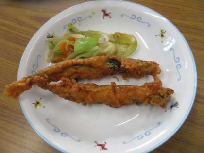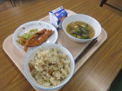 まいたけごはん、にらのみそ汁、ししゃもの紅葉揚げ、菊入おひたし、牛乳 まいたけごはんには、まいたけ、ニンジン、ゴボウなどが入っていてモッチリしていておいしいです。ごはんを食べた後、みそ汁をすすります。ニラ、玉ねぎ、モヤシ、豆腐が入っていてこちらもヘルシーで栄養満点です。菊のおひたしということで楽しみにしていましたが、私のお皿には入っていませんでした。残念!!ししゃもの紅葉揚げはカラッとしていてしっぽの先まで食べられます。残さず全部食べました。ここ数日寒かったのですが、今日は一転、小春日和です。気候というのも食事に影響を与えるようで、なんだかまた、お腹がすいてきました。