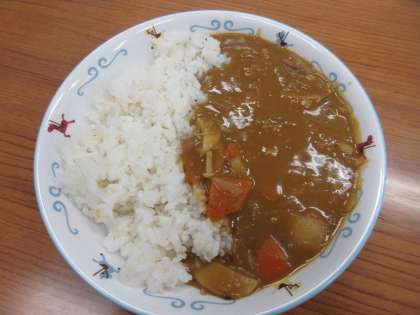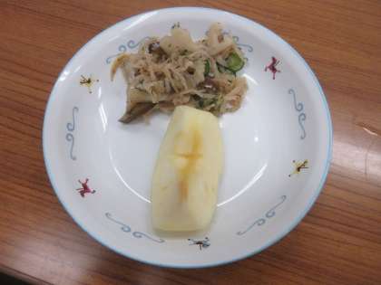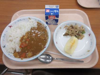 鶏豆きのこのカレーライス、手作り福神漬け、果物(リンゴ)、牛乳 今日はみんな大好きカレーライスです。鶏肉、レンズ豆、玉ねぎ、きのこが入っていましす。きのこもエリンギ、エノキ、シメジなどが入っていて、さらにヨーグルトも入っていてコクが出て、とても美味しいです。福神漬けも手作りです。福神漬けと聞くと赤い色を思い出しますが、今日の福神漬けは赤くありません。切り干し大根、レンコン、カブ、キュウリなどが入っていてこちらも美味しかったです。デザートはリンゴ。リンゴの種類はわかりませんが山形産とのことでした。もしかすると熊も大好きかもしれません。久々のカレーライス、生徒たちもたくさん食べて残菜はいつもより少なかったようでした。私は毎日カレーライスでもOK牧場です。