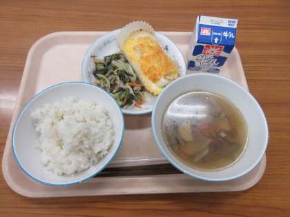 麦ごはん、白身魚の紅葉焼き、ひじきサラダ、いものこ汁、牛乳 寒い日にはいものこ汁はごちそうです。温かいしょうゆ味の汁に里芋、大根、ニンジン、ゴボウなどの根菜が入っていて豚肉とよく合います。山形では芋煮というと牛肉を使うそうですが、山を越えてお隣の宮城県に行くと豚肉を使うそうです。今日のいものこ汁は宮城県の味がしました。紅葉焼きの白身魚はタラです。タラの身にマヨネーズとニンジンを混ぜたソースがかかっていて、それをオーブンで焼いています。こちらもgoodでした。ひじきのサラダにはもやし、ネギ、キュウリがゴマみそ味のドレッシングとあえてあり、こちらもさっぱりしていて美味しいです。今日は一段と寒さを感じます。温かいお汁は最高のごちそうです。