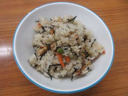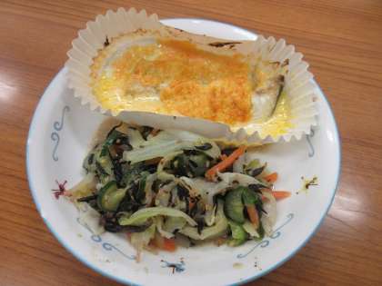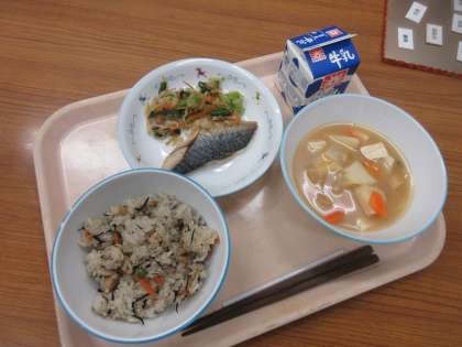 ひじきごはん、塩サバ、おかかあえ、野菜椀、牛乳 ひじきごはんにはひじき以外にもニンジン、グリンピース、糸こんにゃく、油揚げ、鶏肉などが入っていてボリューム満点、とてもおいしいです。おかずの塩サバは塩味が程よく、骨もないので食べやすいです。おかかあえには、小松菜、ニンジン、キャベツ、もやし、白菜などが入っていてサッパリしています。野菜椀はじゃがいも、ニンジン、豆腐などが入ったみそ汁です。ご飯を食べた後、お汁をすすります。寒い日なので野菜椀は体も心も温まります。寒さに負けず、元気に過ごしたいものです。