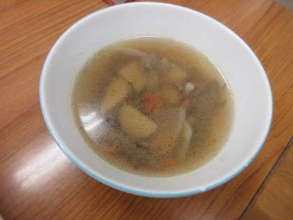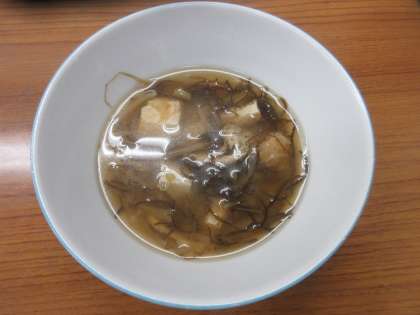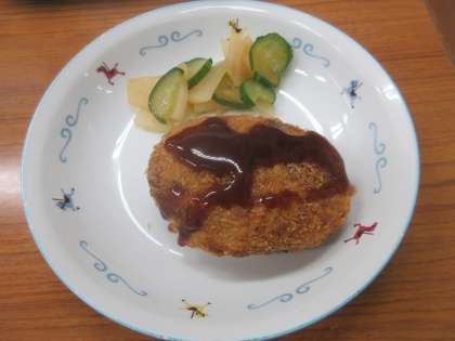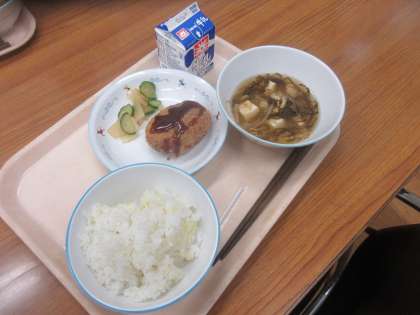 きびごはん、肉じゃがコロッケ、華風大根、もずくのみそ汁、牛乳 コロッケは挽肉、ジャガイモ、ニンジンなどが入っていて味が肉じゃがの味付けになっていました。外はカリッと中はトロッとしていてとても美味しいです。キビが入ったモチモチ食感のごはんとよく合います。よく噛んでからもずくのみそ汁で流し込みます。もずく、もやし、油揚げ、木綿豆腐が入ったみそ汁はもずくのヌルヌル感がとても体によさそうです。コロッケを一口、ごはんも一口、よく噛んでみそ汁をズルズルと飲んで、あっという間に完食です。もう一つコロッケが食べたかったです。