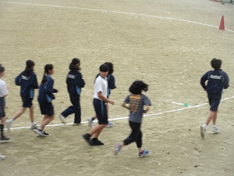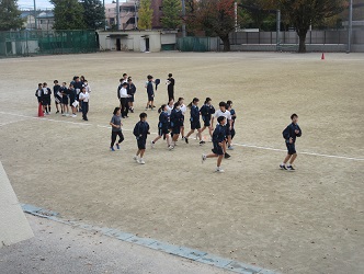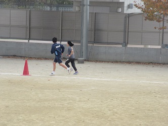 18日(火)5時間目、ふと校庭を見ると3年生が12分間走という持久走を行っていました。みんなしっかり走っています。ところがアレ?中学生には見えない人が生徒と一緒に走っていました。なんと校長先生です。“大丈夫か?”“倒れたら大変だ”など見ていた先生たちは心配します。副校長先生の話ですと普段から走っているので大丈夫だとのこと、でも心配でついつい見てしまいました。心配しましたが、無事完走!見学の生徒達からも応援されていました。元気な校長先生です。
