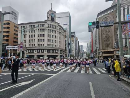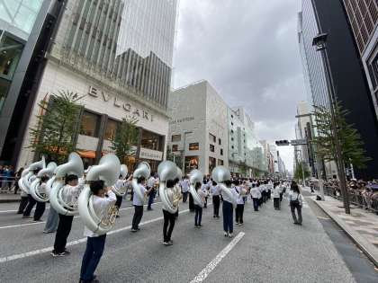 本校吹奏楽部員も、練馬区中学校合同バンドの一員として出演いたしました。 区内14校、約300人の仲間と隊列を組み、歩きながらの演奏でした。 当日は突然の雨に見舞われたものの、明るく楽しくそして元気いっぱいに銀座の街を盛り上げてくれました。 応援に駆け付けていただいた先生方、保護者の皆様、 ありがとうございました。