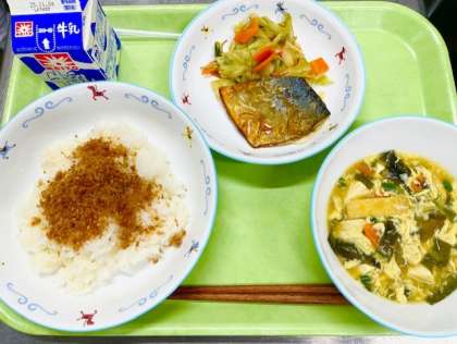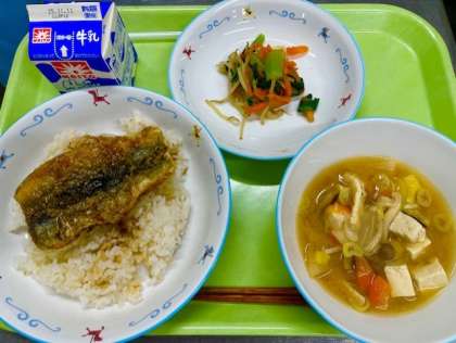 ・さんまのかば焼き丼 ・野菜の辛子醤油あえ ・秋のみそ汁 ・牛乳 10月31日給食