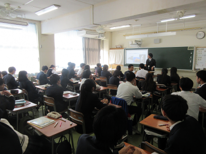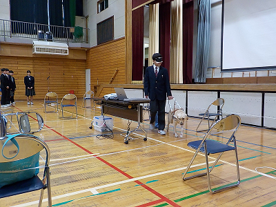 3時間目は本日のテーマである「公正、公平、社会正義」について各クラスで公開授業を行った後、4時間目に盲人更生援護施設公益財団法人アイメイト協会の方を講師にお招きしてご講演いただきました。 講演の終盤では、目隠しをした代表生徒と『EYE MATE ――私(I)の愛(あい)する目(EYE)の仲間(MATE)』として活躍する盲導犬が、障害物を避けながら進む歩行体験を行いました。 今回を通して感じたことや考えたこと、貴重な経験を大切にして、差別や偏見のない社会を実現させてほしいと思います。