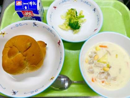 ・ぶどうパン ・シュクメルリ ・ブロッコリー入りサラダ ・牛乳 道徳地区公開講座(盲人更生援護施設公益財団法人 アイメイト協会)
