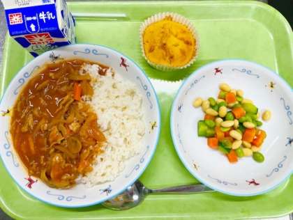 ・ハッシュドポーク ・豆と野菜のマリネ ・かぼちゃケーキ ・牛乳 10月30日給食
