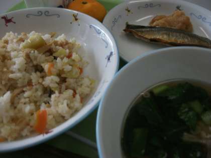 今日は「秋の吹き寄せごはん(栗、さつまいも) さんまの塩焼き・大根おろし・きのこ汁・果物(みかん)」でした。1年生が家庭科の時間に考えた献立です。工夫した点を紹介します。