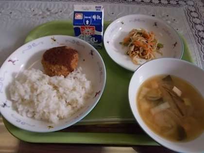 今日は「五穀ご飯・豚ごぼうハンバーグ・切り干し大根とピーマン炒め・根菜汁」でした。11月8日は「いい歯」のごろ合わせで「いい歯の日」です。硬いものをよく噛んで食べるとだ液が多く出て、食べ物を消化しやすくなるといわれています。よく噛んで食べましょう。