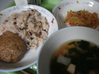 今日は「豆わかめご飯、ブリの照り焼き、野菜の和風ゴマ炒め、月見汁」でした。