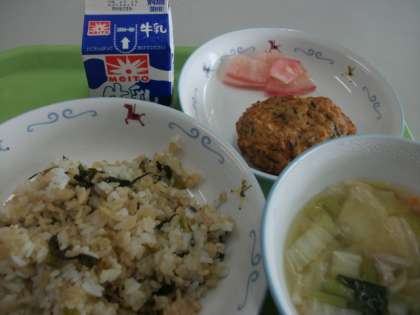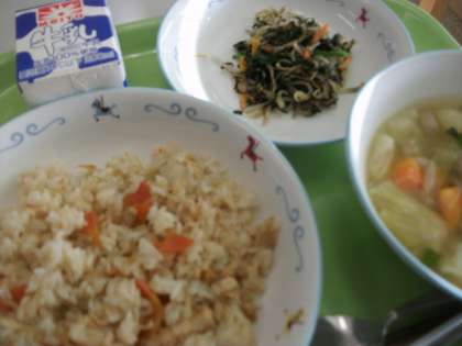 今日は「雑魚と小松菜のチャーハン・じゃがいもと豚肉のピリ辛炒め・肉団子入り中華スープ」でした。ちりめんじゃこは、カタクチイワシを中心に、ウルメイワシやマイワシなどイワシ類の稚魚が使われています。