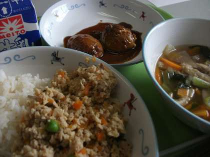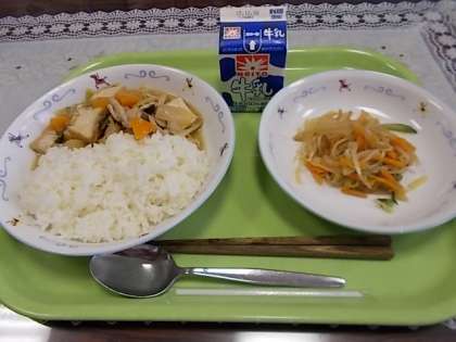 今日は「高野豆腐のそぼろ丼、のっぺい汁、月見団子の黒蜜がけ」でした。
