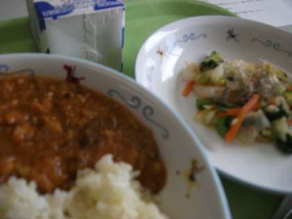 今日の給食は「ひよこ豆とひき肉のカレー、じゃこの和風サラダ」でした。ひよこ豆は鳥のくちばしのような突起があり、名前のとおりひよこのような形をしているのでひよこ豆といわれています。