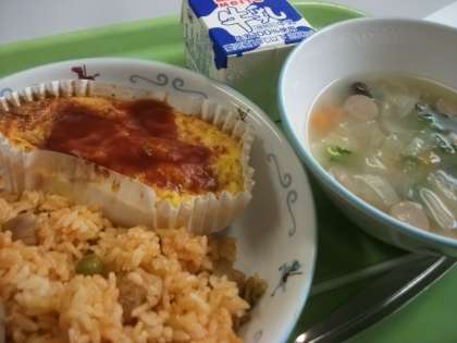 今日は「チキンライス、スペイン風オムレツ、コロコロ野菜とキノコのスープ」でした。秋が旬の「きのこ」。オムレツだけではなく、炒めるだけでもおいしく食べることができます。ミネラル・ビタミン・食物繊維が豊富なキノコ類です。