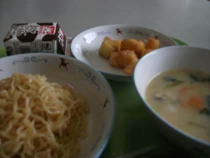 今日は「豆乳麺・みそポテト」でした。みそポテトは埼玉県の郷土料理です。油で揚げたじゃがいもに甘めのみそだれをかけた、埼玉県秩父の名物です。現地で食べたことがある人もいるかもしれませんね。