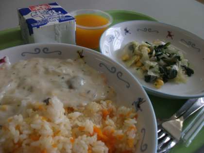 今日は「キャロットライスのえびクリームソース、ほうれん草とコーンのソテー・夕焼けゼリー」でした。今日は、目の愛護デーです。目をいたわり、目の健康について考える日にしてみましょう。