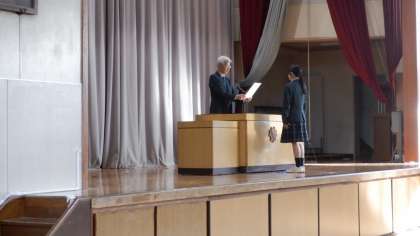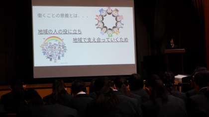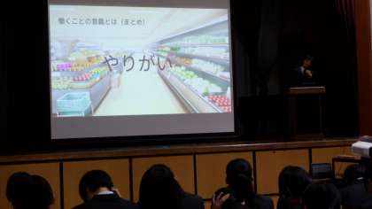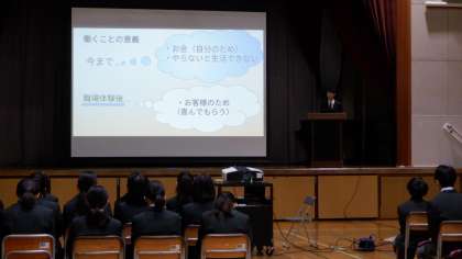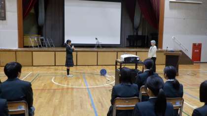 1時間目に、2年生の総合で、9月に行った「職場体験」についての発表会を行いました。各クラスから2名ずつ選ばれた代表生徒によるプレゼンテーションです。1年生も自分のタブレットを使い2年生の発表を視聴しました。2年生へのコメントを記入しました。
