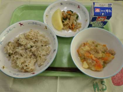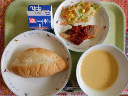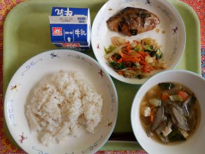 さつまいもごはん 魚の紅葉焼き 白す入りおひたし 具沢山汁 牛乳 【和食を意識して食べよう献立】 秋の味覚である「さつまいも」をご飯と一緒に炊き込んで「さつまいもごはん」としておいしくいただきました。 また、今日の魚の「ぼら」は、マヨネーズににんじんを合わせて、もみじ焼きにしました。この「もみじ」のように、和食は季節の移ろいの表現もできることが特色ともいえます。 そして和食は、健康的な食生活を支えるための栄養バランスの良い献立も可能です。具沢山汁のように、汁物にたくさんの具を入れることができ、いろいろな食材を一度に食べることができるからです。 11月は「和ごはん月間」です。和食を意識し、和食を食べる機会を増やす期間にしましょう。