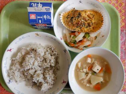 ごまごはん ひじきと豆腐の卵よせ 短冊あえ じゃがいものみそ汁 牛乳 【「和食の日」献立】 11月は「和ごはん月間」、そして11月24日は『いい(11)に(2)ほんしょ(4)く』と読む語呂合わせから、「和食の日」と制定されています。今年は24日が勤労感謝の日の振替休日ですので、少し早いですが、今日の給食を「和食の日」献立にしました。 和食の基本は「だし」を使うことです。だしは「こんぶ」「かつおぶし」「にぼし」などを煮出した汁です。この「だし」を使う「おかず」である「みそ汁」はごはんと良く合います。 和食を毎日の食生活に活かすことで、栄養素をバランスよく取り入れたり、動物性脂肪を減らしたりすることができます。また、「だし」を効果的に使うことで減塩につなげることもできます。 「和食の日」をきっかけに、日々の食生活も見直してみてはいかがでしょうか。