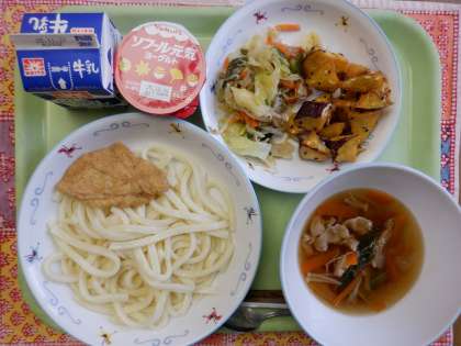 きつねうどん 大学芋 じゃこの和風サラダ ヨーグルト 牛乳 【カルシウムたっぷり献立】 成長期の子どもは成人に比べて骨の成長が活発です。丈夫な骨や歯を作るために、カルシウムは大切な栄養素です。 カルシウムは、牛乳・チーズ・ヨーグルトなどの乳製品や骨ごと食べられる小魚、豆腐や納豆などの大豆製品、野菜類、海藻などに多く含まれます。 牛乳などの乳製品は他の食品に比べてカルシウムの吸収率が高いうえに、一回の摂取量も多いので、効率よくカルシウムをとることができます。 今日の給食のように、牛乳・チーズ・ヨーグルトなどの乳製品から一日2品食べるのを目標にすると良いそうです。