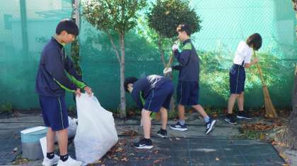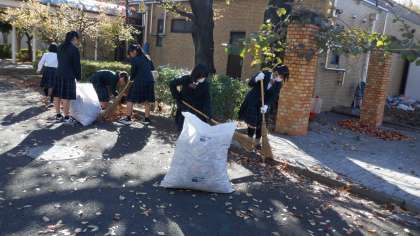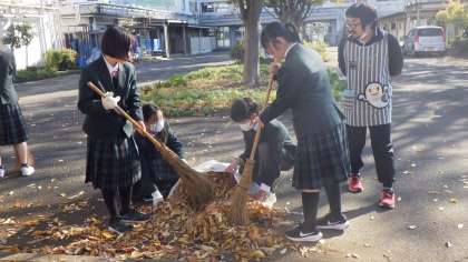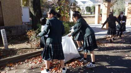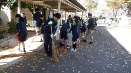 前庭は赤色、黄色、様々な色の落ち葉で埋め尽くされていました。1年生のクリーン運動はとてもやりがいがありました。皆で協力して、落ち葉を袋にどんどん詰め込みました。落ち葉の袋がすぐに山になり、前庭はとても綺麗になりました。