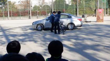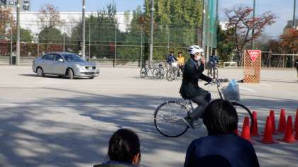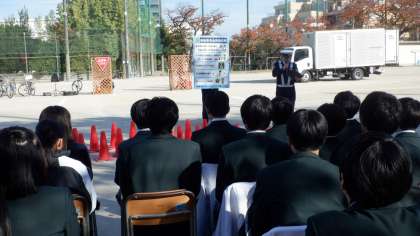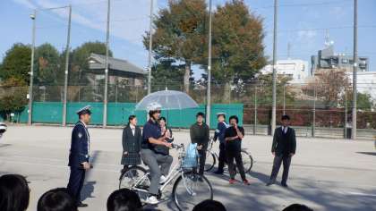 スケアードストレイト方式による交通安全教室が行われました。交通事故の衝撃を体験することをとおして、自転車のルール違反がいかに危険かを視覚的に理解させるのが目的です。はじめに光が丘警察の方から、「自転車五則」のお話を伺い、代表生徒が危険運転の実技体験をしました。