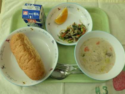 胚芽パン 肉団子と白菜のクリーム煮 豆入りひじきサラダ 夢オレンジ 牛乳 【食物繊維たっぷり献立】 胚芽パンの「胚芽(はいが)」には、食物繊維が豊富に含まれています。本来は小麦を製粉する際に捨てられてしまう部分で、発芽に必要な栄養素が蓄えられています。 最近では、「胚芽」を健康食品として利用することが増えており、疲労回復や貧血改善などが期待できるということです。
