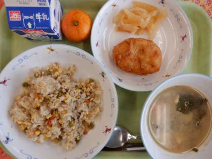 チャーハン もちもち豆ポテト カクテキ わかめスープ みかん 牛乳 【かみかみメニュー】 「カクテキ」は、大根で作るキムチです。今日は練馬産の大根を使っています。大根のみずみずしさとシャキッとした歯ごたえを感じながら、おいしくいただきました。 「もちもち豆ポテト」は、コロッケのようなパン粉の衣はなく、具に大豆が入っているシンプルなものでした。カリッと揚げられたポテトは食べ応えも充分でした。