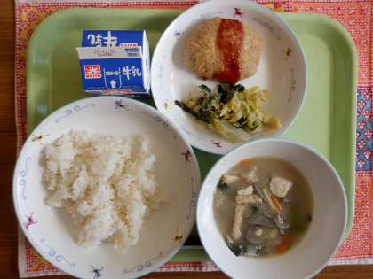 発芽玄米入りごはん 大豆ハンバーグ じゃこと小松菜炒め 十種のみそ汁 牛乳 【地産地消献立】 今日のみそ汁には、 1.とり肉 2.油揚げ 3.豆腐 4.小松菜 5.にんじん 6.大根 7.ごぼう 8.れんこん 9.ねぎ 10.じゃが芋 と10種類の具材が入っていました。だから「十種のみそ汁」です。 地産地消献立としての野菜は、練馬産の大根でした。たくさんの具材が入っていたので、味わい深いみそ汁となっていましたね。 これから寒い日が続きます。いろいろな食材を摂り入れて体内環境を整え、風邪をひかない体づくりをしましょう。