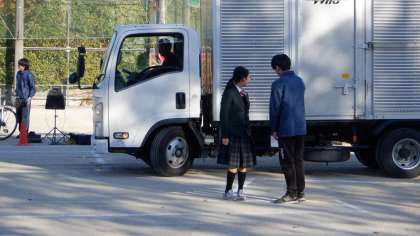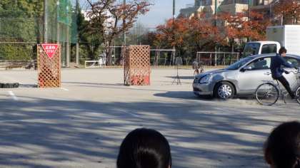 後半はスタントマンによる交通事故の再現です。代表生徒に、トラックの内輪差体験、ヘッドホン装着時車に気付けるかという体験をしてもらいました。間近で車と自転車の接触を見ると、とても迫力があります。生徒たちには、体験したことを忘れず、交通安全に役立ててほしいです。