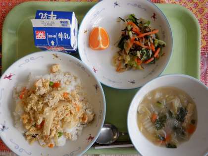 豚キムチ丼 中華和え ワンタンスープ マロンプリン 牛乳 【野菜たっぷり献立】 「キムチ」は白菜などの野菜を塩漬けにして、唐辛子、ニンニク、ショウガ、魚介塩辛などの薬味とまぜて発酵させた韓国の漬物です。 キムチにたっぷりの豚肉を加えた今日の給食の「キムチ丼」は、程よい辛みがあり、ごはんと良く合っていて、とてもおいしかったですね。 中華和えやワンタンスープにもたくさんの野菜が入っていました。 好き嫌いなく、残さず食べてバランスの良い食生活を心がけましょう。