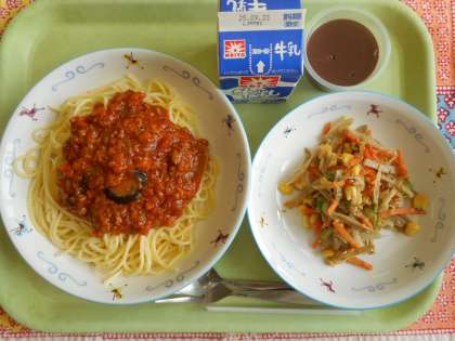なすのミートスパゲティ ごぼうサラダ ココアプリン 牛乳 【旬の食材献立】 秋が旬の食材には、以下のようなものがあります。 いも類(さつまいも、里芋、じゃがいも、れんこんなど) きのこ類(松茸、しいたけ、しめじ、舞茸など) 根菜類(にんじん、かぶ、ごぼうなど) 野菜(なす、かぼちゃなど) 果物(ぶどう、梨、栗、柿、りんごなど) 味わい深く栄養価が高い食べものが多いのが特徴です。こうした旬の食材には、季節の変わり目に必要な栄養が多く含まれています。 今日の給食では、ミートスパゲティに『なす』が、サラダに『ごぼう』がたっぷり入っていました。 明日から急に気温も低くなるようです。給食を残さずに食べて、体調管理に努めましょう。 ![]() ![]() 9月17日の給食