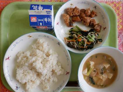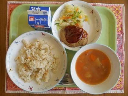 ガーリックライス 大豆入りハンバーグ キャベツとコーンのサラダ 麦入りミネストローネスープ 牛乳 【大豆でヘルシー献立】 「畑の肉」といわれる大豆には、肉に匹敵する良質な植物性たんぱく質が豊富に含まれています。 大豆からつくられる食べものには、味噌やしょう油、豆腐などがあり、今日の給食の「大豆ハンバーグ」には、豆腐と大豆を細かく刻んだものが入っていました。こうすることで、ひき肉の量が少なくてもボリュームはそのままにおいしくいただくことができます。 ヘルシーと言えば、「麦入りのミネストローネスープ」には、プチプチとした大麦が入っていたのですが、気が付いたでしょうか。いつもは、麦ごはんとして食べている「大麦」ですが、今日は一粒一粒、もっちりとした食感をより感じやすかったように思います。 ![]() ![]() 9月25日 3年修学旅行 2日目 6 夕食