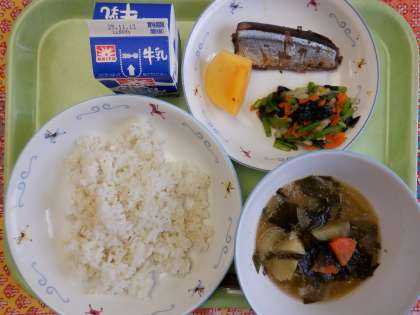 麦ごはん さんまのじっくり煮 白菜ののり和え 豆腐のごまみそ汁 柿 牛乳 【魚を食べよう献立】 秋の味覚の代表的な魚である「さんま」には、血液の流れを良くする成分や脳細胞を活性化させ、頭の回転を良くする効果があると言われています。12日からの定期考査に向けて、「さんま」を食べて勉強に励みましょう。 給食の「さんま」は、じっくり煮てあるので、味が良くしみていて、骨までおいしくいただくことができました。