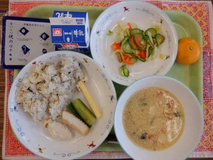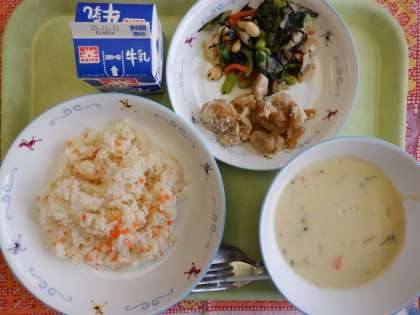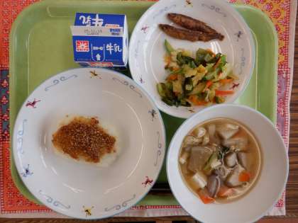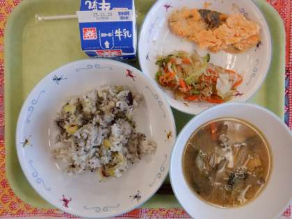 さつまいもごはん 魚の紅葉焼き 白す入りおひたし 具沢山汁 牛乳 【和食を意識して食べよう献立】 秋の味覚である「さつまいも」をご飯と一緒に炊き込んで「さつまいもごはん」としておいしくいただきました。 また、今日の魚の「ぼら」は、マヨネーズににんじんを合わせて、もみじ焼きにしました。この「もみじ」のように、和食は季節の移ろいの表現もできることが特色ともいえます。 そして和食は、健康的な食生活を支えるための栄養バランスの良い献立も可能です。具沢山汁のように、汁物にたくさんの具を入れることができ、いろいろな食材を一度に食べることができるからです。 11月は「和ごはん月間」です。和食を意識し、和食を食べる機会を増やす期間にしましょう。