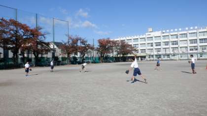 E組の体育は、Tボールの授業です。キャッチボールも上手です。ボールをつなぐ、ミニゲーム形式にも取り組みました。