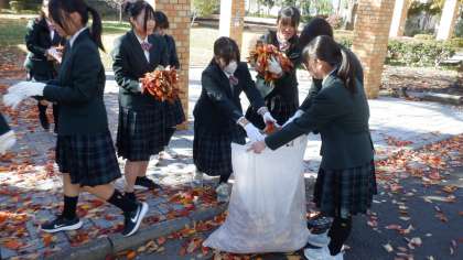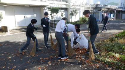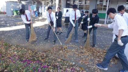 今日から昼休みを使って「クリーン運動」が始まります。生徒会行事であり、美化委員が中心となって呼びかけています。今日の担当は3年生でした。前庭には落ち葉がたくさん落ちていて、ほうきでもはくことができないほどでした。あたたかい日差しの中、生徒たちは一生懸命落ち葉拾いをしていました。