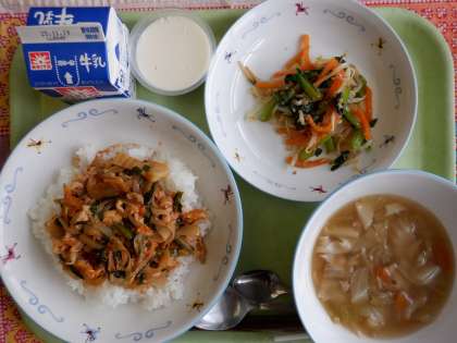 豚キムチ丼 中華和え ワンタンスープ マロンプリン 牛乳 【野菜たっぷり献立】 「キムチ」は白菜などの野菜を塩漬けにして、唐辛子、ニンニク、ショウガ、魚介塩辛などの薬味とまぜて発酵させた韓国の漬物です。 キムチにたっぷりの豚肉を加えた今日の給食の「キムチ丼」は、程よい辛みがあり、ごはんと良く合っていて、とてもおいしかったですね。 中華和えやワンタンスープにもたくさんの野菜が入っていました。 好き嫌いなく、残さず食べてバランスの良い食生活を心がけましょう。
