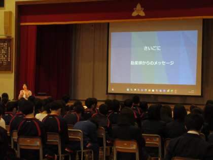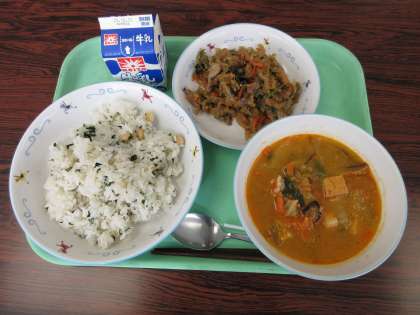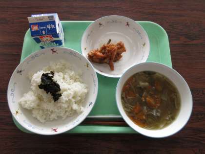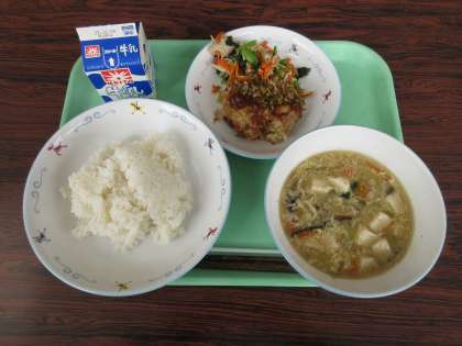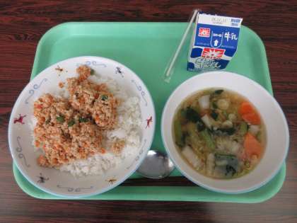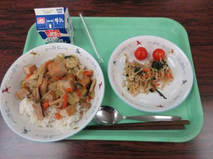 【本日の献立】 「家常豆腐丼」「切り干し炒めナムル」「プチトマト」「牛乳」 ☆今日、2年生は「上級学校訪問」に出かけました。早いもので、一年 後には進路決定の時期を迎えます。中学校卒業後にはどのような進路 があるのか。進路選択に向けて調べ方を学び、少しずつ情報を収集し て主体的に動けるようにしておくことが大切です。 また、学校外に出てることは公共のルールやマナーの勉強にもなりま す。社会の一員になるための小さな一歩を踏み出しました。 11月26日(水)