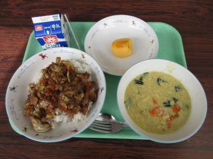 「ホイコーロー丼」「粟米湯 (スーミータン)」「果物(柿)」 「牛乳」 ☆ 「給食だより」から ☆ = 今月の果物 = 今日は、秋を代表する果物のひとつ「柿」です。和歌山県紀の川町か ら取り寄せました。 ♪柿食えば鐘が鳴るなり法隆寺 と詠われるように近畿地方を代表す る果物でもあります。秋空を背景に、農村風景にはオレンジ色の実が 色鮮やかです。 10月27日(月)
