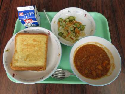 【本日の献立】 「フレンチトースト」「チリコンカーン」「すりおろしドレサラダ」 「牛乳」 ☆今朝の気温は10度を少し超えたぐらいで、寒い朝になりました。 日ごにに秋が深まっていきます。 秋の深まりとともに、巷では街中に出没する野生のクマのニュースが 連日報道されています。人々の暮らしを守り、野生の生き物と共存す る取り組みが模索されています。命ある物同士、どのように暮らして いくべきか、みんなで考えたい課題です。 10月29日(水)