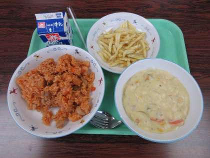 「チキンライス」「フライドポテト」「パンプキンチャウダ」 「牛乳」 ☆いよいよ10月も終わりです。月めくりのカレンダーも残り2枚となっ てしまいました。 今日は“ガスの日”だそうです。明治5年、横浜の馬車道に日本ではじ めてガス灯が灯った日です。150年以上前の出来事です。日が沈むと 闇に包まれていた時代です。街を明るく照らすガスの灯は、人々の心 にも明かりを点したことでしょう。 10月30日(木)