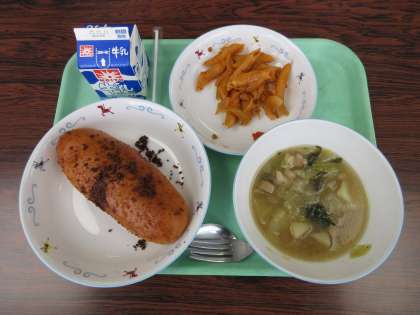 「ココア揚げパン」「ペンネソテー」「ねり丸キャベツポトフ」 「牛乳」 ※本日は“ねり丸キャベツ一斉給食”献立です。 ☆ 「給食だより」から ☆ キャベツは練馬を代表する野菜のひとつです。地元の産業を広く知っ てもらうために練馬区では「ねり丸キャベツ一斉給食の日」をもうけ ています。今日の給食は、練馬区産ねり丸キャベツを使用してポトフ を提供します。 11月4日(火)
