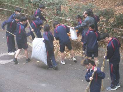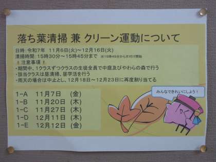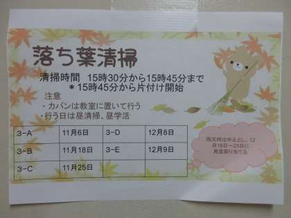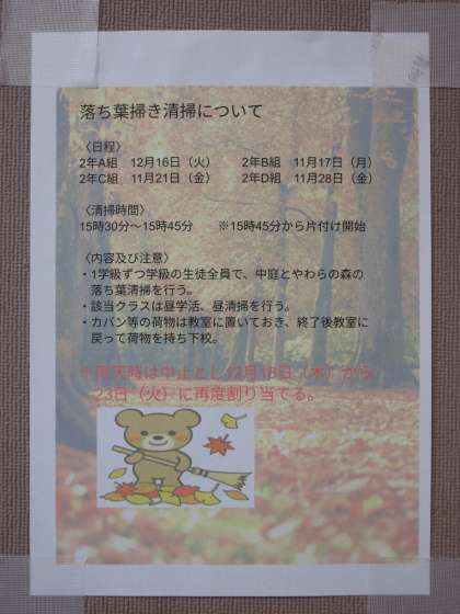 【本日の献立】 「高野豆腐のそぼろ丼」「芋団子汁」「牛乳」 ☆秋が一段と深まり、谷原の森も日ごとに木々の色づきが増してきまし た。学校は、今日から「落ち葉清掃」が始まります。整美委員会が中 心になって企画し、一日一クラスが分担して学校の敷地内外の落ち葉 を回収します。落ち葉の一部は谷原の森で堆肥にして自然に帰します。 11月5日(水)